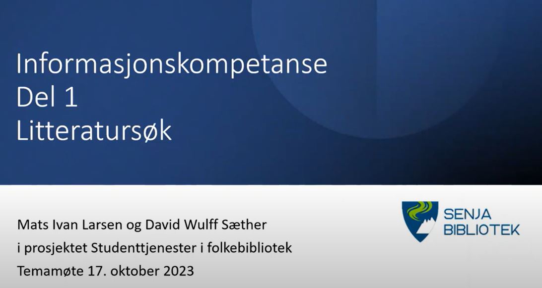 Temamøtene om informasjonskompetanse ble presentert på tematirsdag i regi av Troms og Finnmark fylkesbibliotek. Her får du en innføring i tre sentrale deler av informasjonskompetanse. David Wulff Sæther og Mats Ivan Larsen ved Senja bibliotek står for innholdet. Vi har også lagt ved de tilhørende powerpointene.